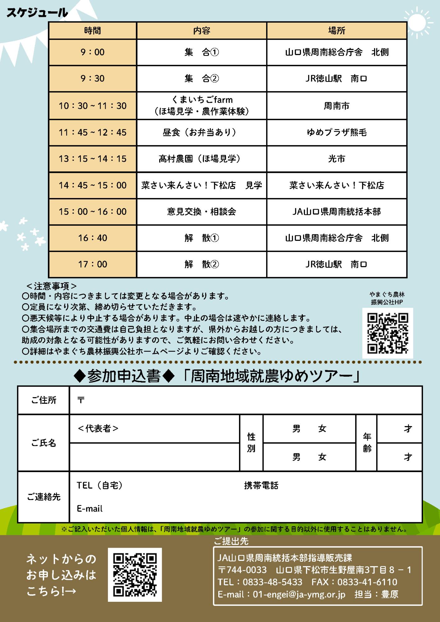 1.チラシ裏面下段の参加申込書に記入の上、チラシ記載の提出先(JA山口県周南統括本部指導販売課)まで提出